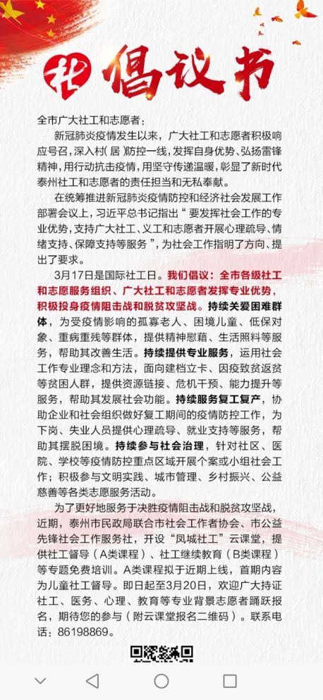 泰州市民政局发布《致全市广大社工和志愿者的倡议书》,号召全市社工和志愿者持续关爱困难群体,持续提供专业服务,持续服务复工复产,持续参与社会治理,为全面决胜疫情阻击战和脱贫攻坚战贡献智慧和力量。