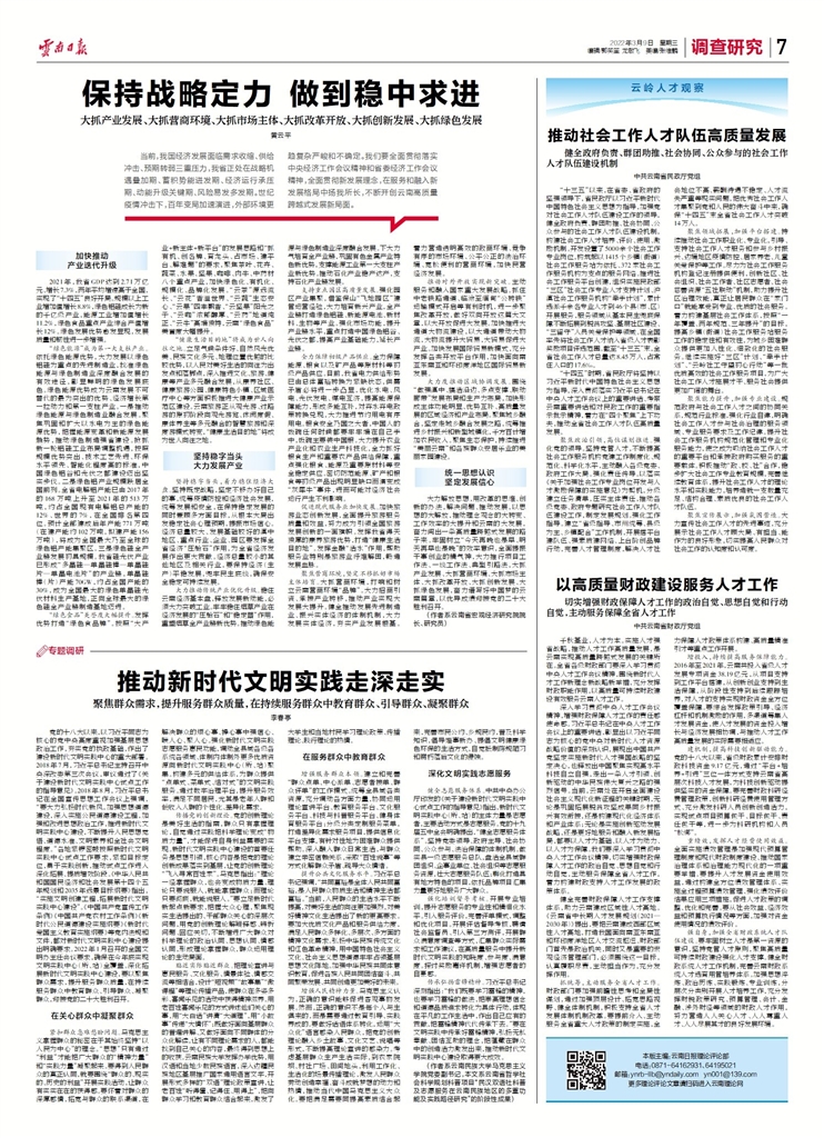 聚焦领域拓展,加强平台搭建。持续推动社会工作职业化、专业化,引导、支持社会工作人才服务和参与乡村振兴、边境地区疫情防控、居家养老、儿童关爱保护等工作。尽力为社会工作服务机构登记注册提供便利,创新社区、社会组织、社会工作者、社区志愿者、社会慈善资源“五社联动”机制,助力提升社区治理效能,真正让居民群众在“家门口”就能享受到专业、优质的社会服务。着力构建基层社会工作体系,按照“一年覆盖、两年规范、三年提升”的目标,提高乡镇(街道)社会工作服务站服务工作的稳定性和有效性,为城乡困难群众提供更加人性化、细致化的社会服务。继续实施好“三区”计划、“牵手计划”、“云岭社工守望初心行动”等一批优质高效的社会工作服务项目,为广大社会工作人才施展才干、服务社会提供更加广阔的舞台。